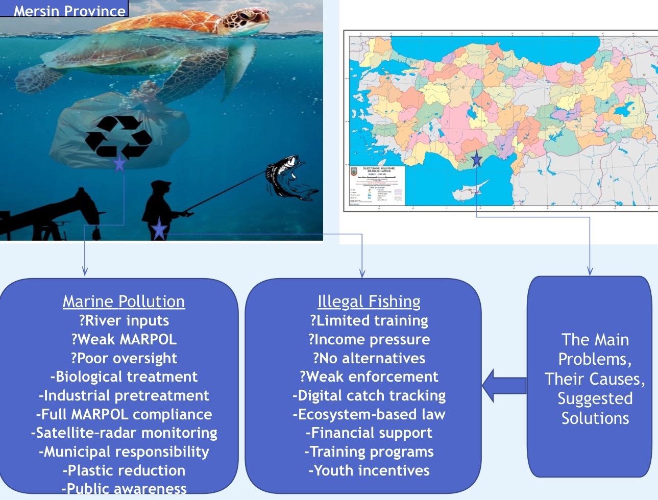 Mediterranean Sea, a semi-enclosed marine system, is increasingly fragile due to rising ship traffic, illegal fishing, microplastic pollution, and land-based contaminants. Mersin, a major port in the Eastern Mediterranean, lies at the intersection of these pressures while hosting trade, tourism, and fishing activities of strategic importance. This study, based on institutional interviews and field analyses conducted in Mersin in 2025, evaluates the local applicability of MARPOL 1973, marine pollution dynamics, and sustainable fishing policies in a multidimensional framework. Findings reveal that pollutants affecting Mersin’s coast are both local and regional, with agricultural drainage, pesticides, heavy metals, and detergent residues transported via the Berdan and Seyhan rivers. These accumulate in coastal ecosystems, intensifying stress on biodiversity. The absence of biological treatment units in wastewater plants and limited regulatory oversight in maritime domains further hinder MARPOL’s effective implementation. Microplastics were detected in fish digestive systems and sediments, highlighting risks of toxic bioaccumulation for ecosystems and public health. In fisheries, despite digital monitoring through the BAGIS system, economic pressures, insufficient education, and unlicensed practices perpetuate illegal fishing. Weak institutional support for small-scale fishers undermines sustainability objectives. The study recommends Türkiye’s stronger engagement in regional governance mechanisms (REMPEC, UNEP/MAP) and acceleration of SECA preparations. The case of Mersin illustrates that sustainable marine management requires not only technical and legal measures but also integrated regional cooperation, infrastructure investment, and local awareness initiatives to safeguard biodiversity and community livelihoods.