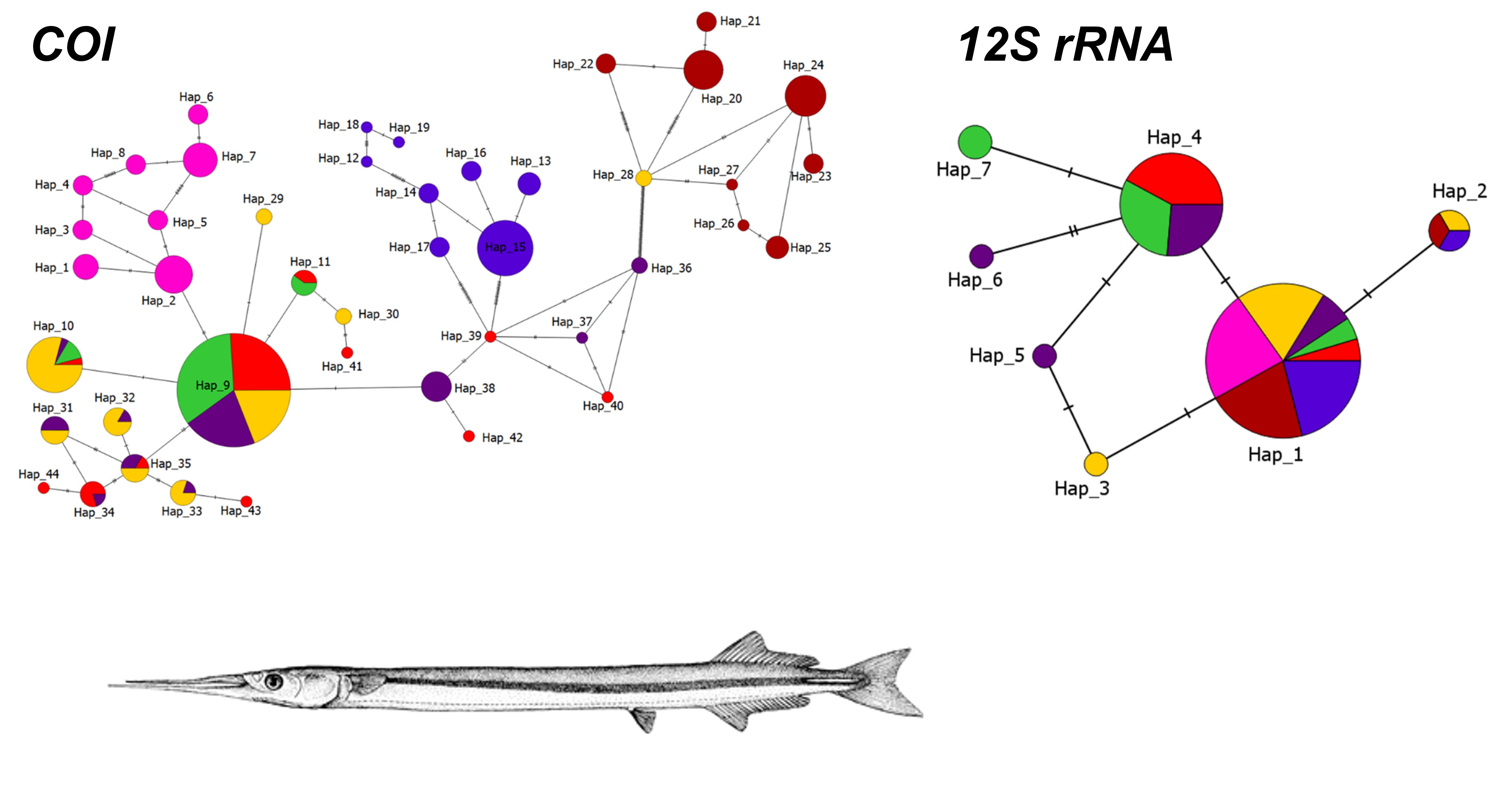 This study investigates the population genetic structure of the short-beaked garfish Belone svetovidovi across the Turkish marine coasts using two mitochondrial markers, cytochrome oxidase I and 12S ribosomal RNA. A total of 280 individuals were sampled from seven sites across the Black Sea, Marmara Sea, and Aegean Sea. Haplotype network analyses showed that COI provided greater resolution, displaying a star-like topology that points to recent population expansion, while 12S rRNA exhibited more conserved patterns, aligning with purifying selection. Tajima’s D values diverged between loci, indicating potential population structuring and demographic processes. Overall, COI captured among-basin differentiation, while 12S rRNA supported deep lineage splits. These findings highlight the complementary nature of mtDNA markers and provide baseline data for future phylogeographic and conservation studies in Belonidae species.